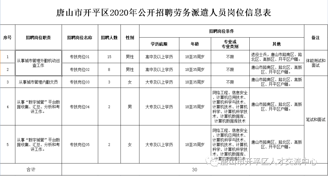 拟公开招聘劳务派遣人员30名,具体招聘人数和岗位条件等详情见《唐山市开平区2020年公开招聘劳务派遣人员岗位信息表》(附件1)。