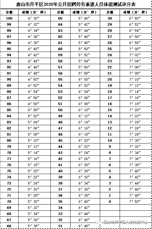 附件2:《唐山市开平区2020年公开招聘劳务派遣人员体能测试评分表》