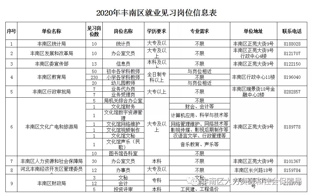 原标题:丰南区人力资源和社会保障局关于公布2020年就业见习岗位信息的通知