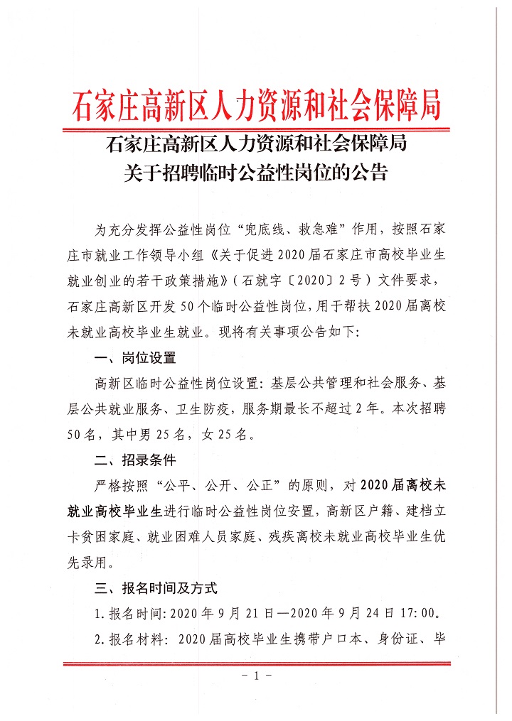 2020河北石家庄高新区临时公益性岗位招聘50人公告-雄安白洋淀招聘网