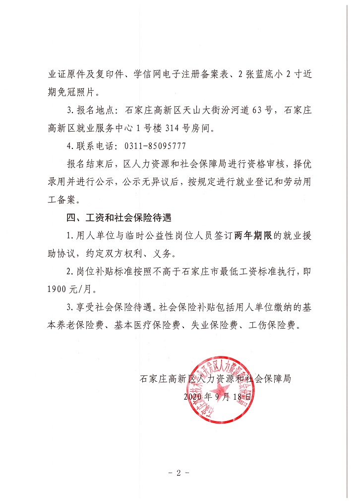 原标题:石家庄高新区人力资源和社会保障局关于招聘临时公益性岗位的公告