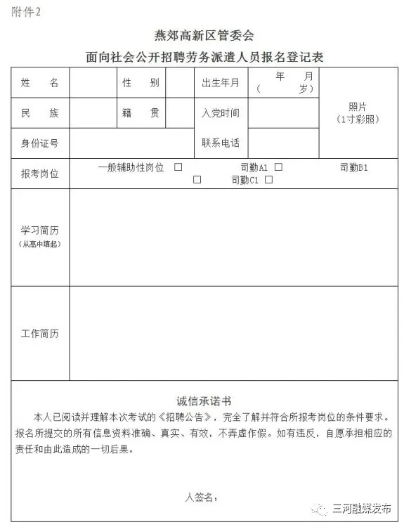 2、《燕郊高新区面向社会公开招聘劳务派遣人员报名登记表》