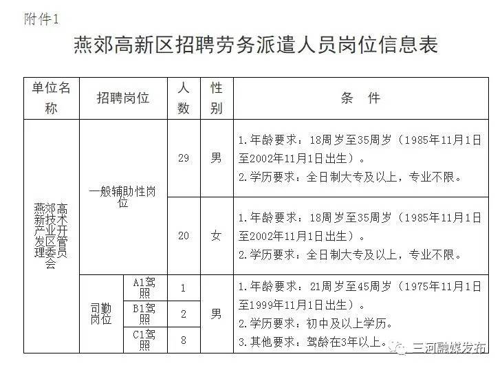 4.学历、年龄条件见《燕郊高新区招聘劳务派遣人员岗位信息表》(附件1)。