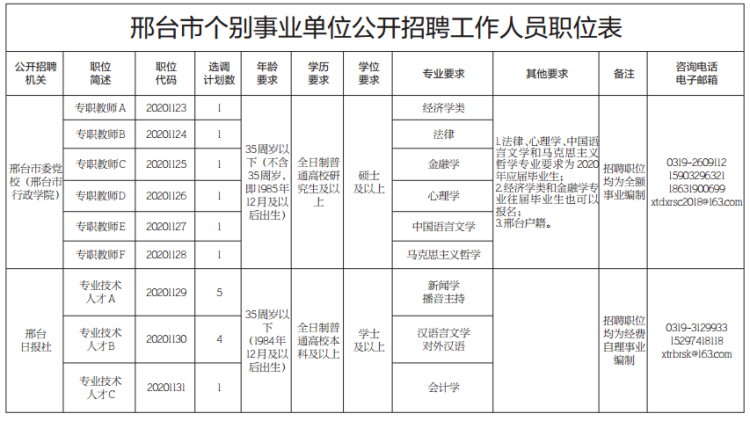 详见《邢台市委党校(邢台市行政学院)、邢台日报社公开招聘工作人员职位表》。