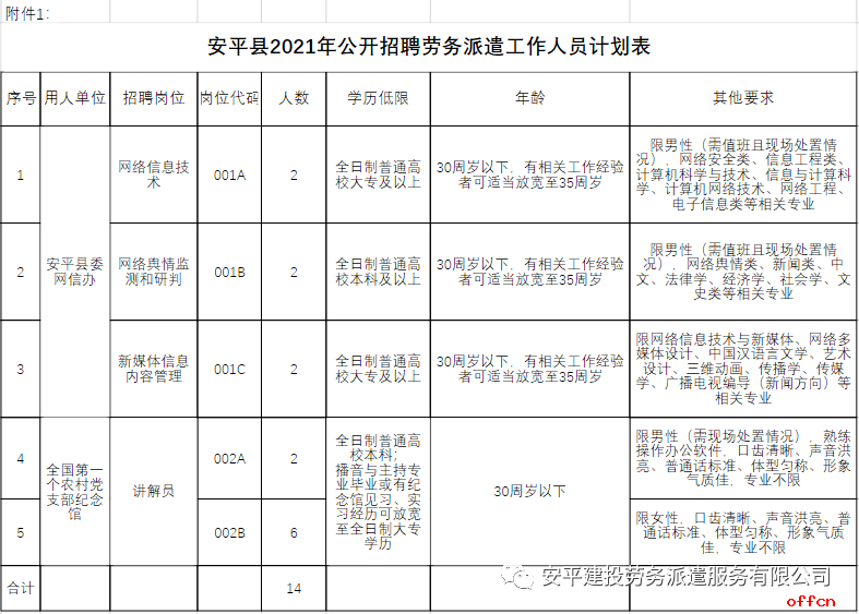 本次拟招聘派遣制工作人员14名。具体职位及要求详见附件1:《安平县2021年公开招聘派遣制工作人员计划表》。