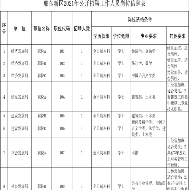 1.招聘岗位所需的具体条件详见《邢东新区2021年公开招聘工作人员岗位信息表》。